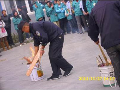 通過實(shí)踐,在空曠的地帶點(diǎn)燃一桶易燃物品,實(shí)踐操作和講解滅火器的正確使用方法和不正確使用方法,后進(jìn)行演示;并安排救援組成員及撲救人員實(shí)際操作滅火器的使用方法。